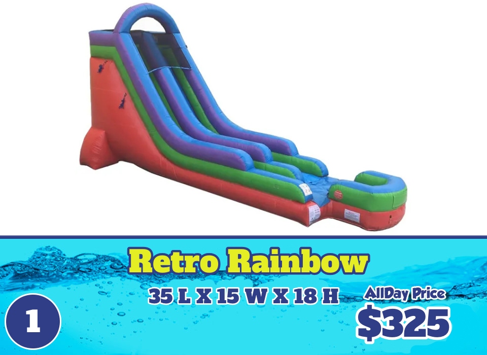 We have water obstacles in 35 ft, 40ft, and 48 feet long. Many of our obstacle courses also include inflatable slides and/or waterslides.
